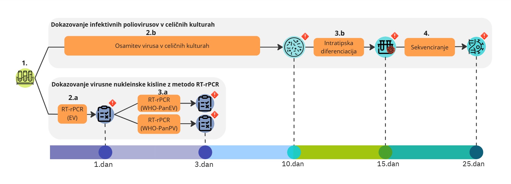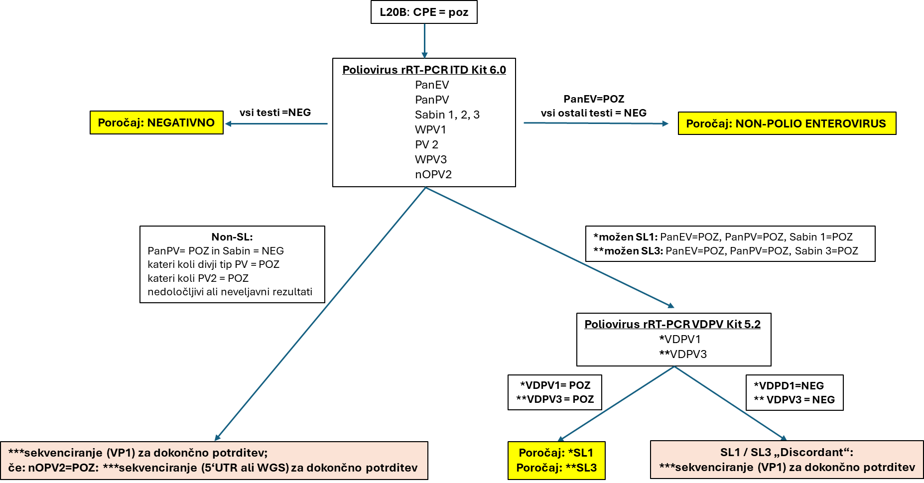 Legenda: L20B – celična kultura; CPE – citopatogeni učinek; EV – enterovirus; PV – poliovirus; WPV – divji poliovirus (angl. Wild Poliovirus); nOPV2 – virus peroralnega cepiva proti otroški paralizi tipa 2 (angl. Novel Oral Poliomyelitis Vaccine type 2); SL – cepilnemu Sabin sevu podoben poliovirus (angl. Sabin-Like poliovirus); VDPV1/VDPV3 – naziv testa za potrditev poliovirusov, pridobljenih s cepivom tipa 1 ali tipa 3; VP1 in 5'UTR – regiji genoma, ki ju sekvenciramo; WGS – sekveciranje celotnega virusnega genoma (angl. Whole Genome Sequencing); *** sekvenciranje in analizo sekvenc je potrebno opraviti v Referenčnem regionalnem laboratoriju (WHO RRL Helsinki).2.4 Interpretacija laboratorijskih rezultatov