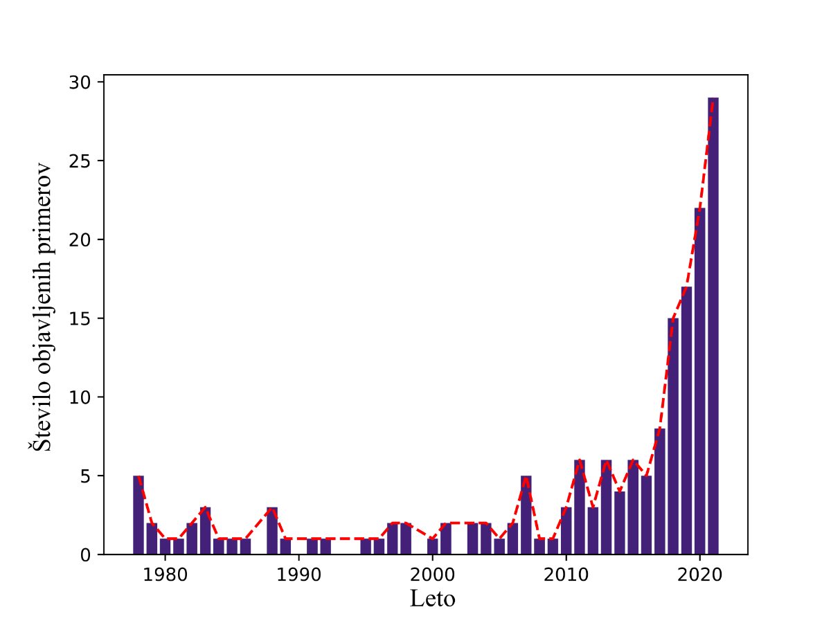 Slika 1: Število objavljenih primerov o resnih zdravstvenih posledicah, povezanih z uporabo dušikovega oksida, v bazi podatkov PubMed, od leta 1978 do leta 2021 (9).