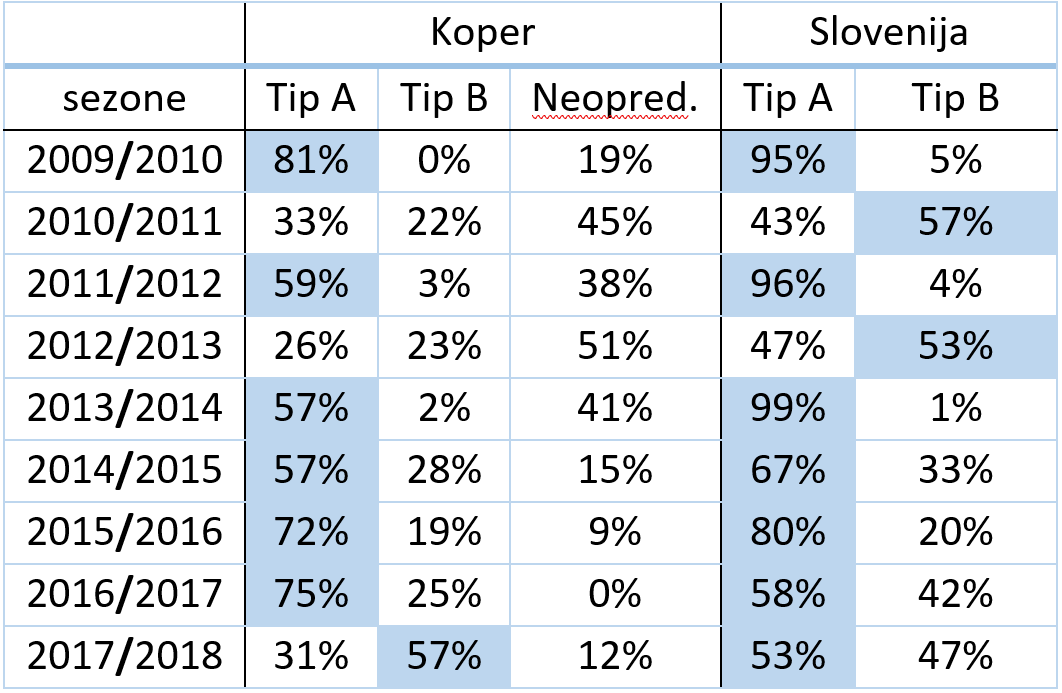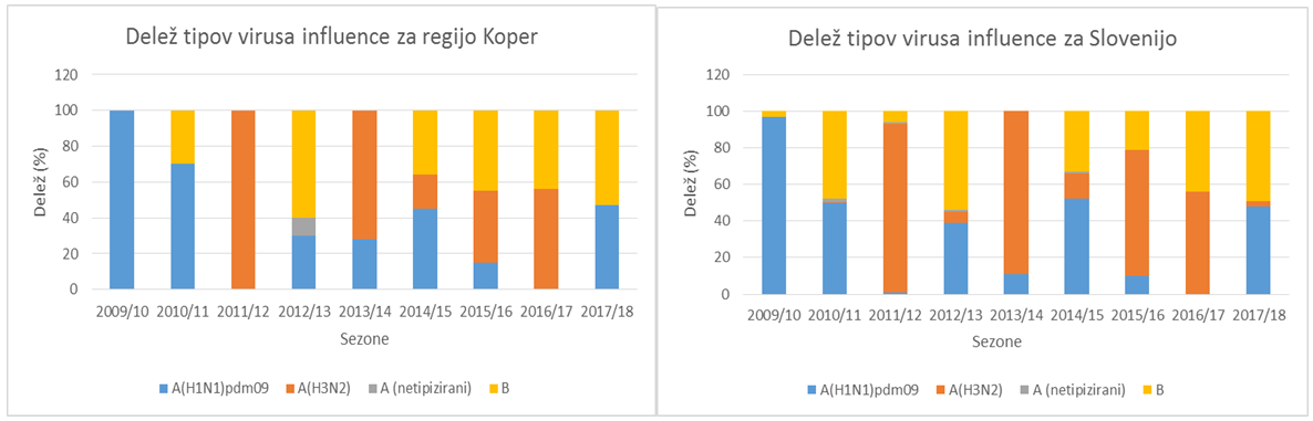 V sezonah med 2009 in 2018 se koprsko in slovensko razmerje med tipi influence A in B ujema z evropskim, razen v sezonah 2013/2014 in 2016/2017 (29)(30)(31)(32)(33)(34)(35)(36)(37)(39). Sezona 2013/2014 se je v razmerju tipa influence A in B na Slovenskem ujemala z evropskim, a je bilo razmerje podtipov drugačno. V slovenskem prostoru je prevladoval podtip influence A(H3N2), v 72 % na koprskem območju in 89 % v Sloveniji (Tabela 6), po celotni Evropi pa je prevladoval podtip influence A (A(H1N1)pdm09 v 70 % (33). V sezoni 2016/2017 je v evropskem prostoru prevladoval tip influence A s 94 %, od tega je 98 % predstavljal podtip influence A(H3N2) (36). V Sloveniji in koprski regiji je bil delež tipa influence A, kjer je prav tako prevladoval podtip influence A(H3N2), 56 %, 44 % pa delež tipa influence B (Tabela 6).
