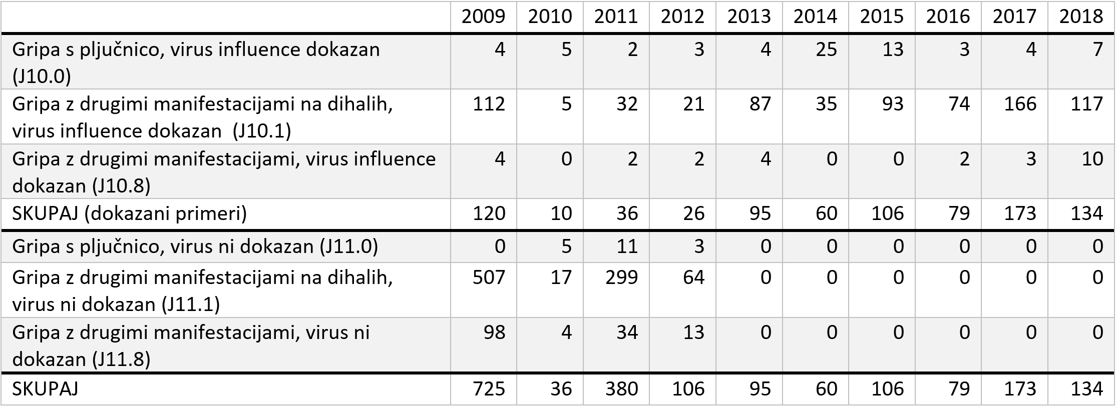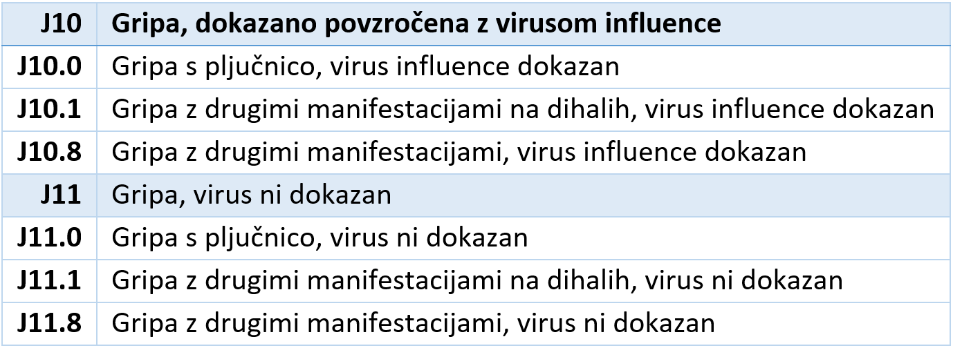 Po Mednarodni klasifikaciji bolezni MKB-10-AM, verzija 11 se gripo označuje s šifro J10 in J11 (16). V nadaljevanju so predstavljene posamezne šifre (Tabela 1). Pod šifro J10 se označuje gripo, ko je povzročitelj laboratorijsko dokazan, z J11 pa gripo, ko povzročitelj ni dokazan.
