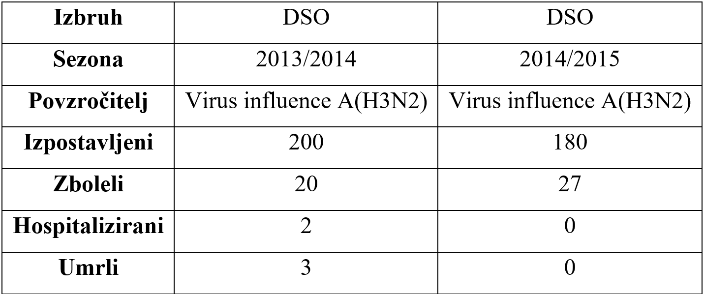 V zdravstveni regiji Koper so med leti 2009 in 2018 zabeležili dva izbruha virusa influence, v obeh primerih je šlo za izbruh virusa influence A(H3N2) v domu starejših občanov. Podrobnejši podatki izbruha so predstavljene v tabeli 3 (27)(28). Laboratorijsko dokazovanje povzročitelja gripe pogosto ni opravljeno, zato imamo malo podatkov o povzročiteljih izbruhov gripe v socialno-varstvenih zavodih.