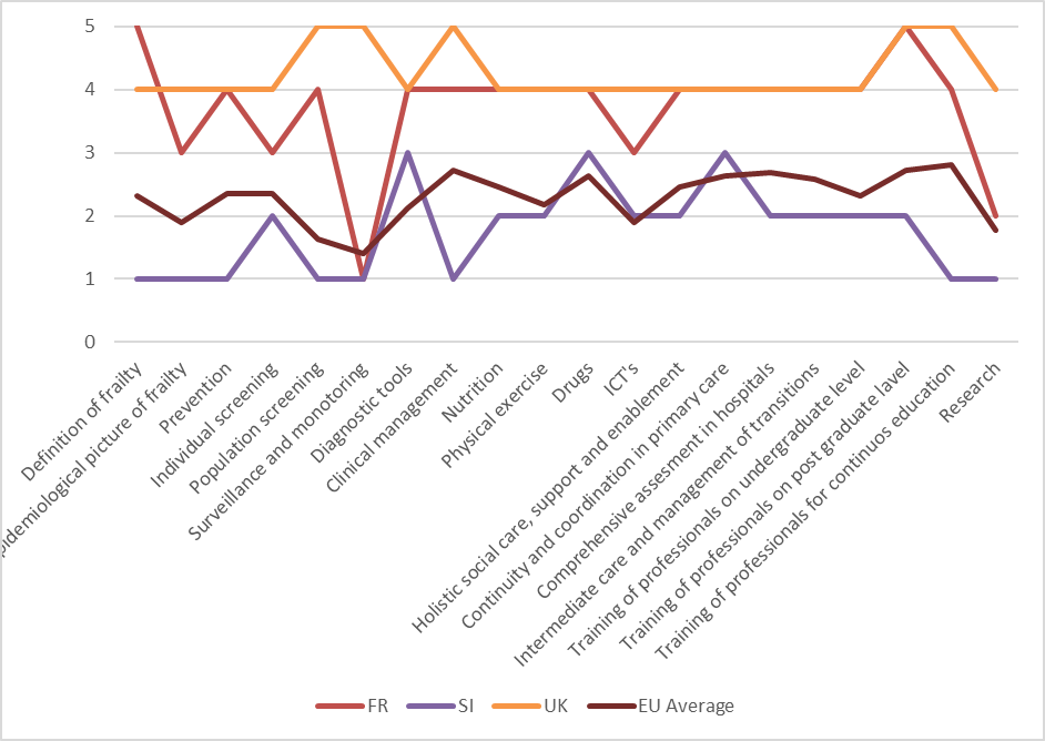 The completed surveys regarding the approaches (strategies, policies, programmes, actions, unmet needs) related to frailty in the participating MS were analysed by the end of May 2018 using descriptive methodology and the Report on the prevention and management of frailty was prepared. MS were classified into five different levels/grades of implementation according to the level of development of frailty action in their country, which was based on 20 variables including definition of frailty, management of frailty, integrated care, education and research. The most advanced countries were Spain with 85 cumulative points and France with 74 points. Slovenia with 35 points was well under EU average (45.63 points; places 15th out of 22 MS).