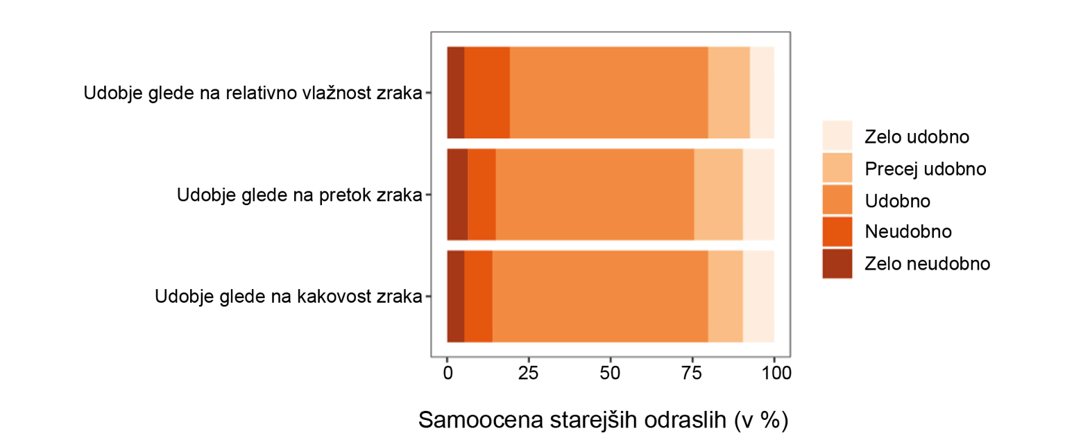 Večina stanovalcev (86 %) je ocenila udobje glede na kakovost zraka, kot »udobno«, »precej udobno« oziroma »zelo udobno«. Prav tako je večina udeležencev dobro ocenila udobje glede na pretok zraka ter udobje glede na relativno vlažnost zraka (in sicer je z »udobno«, »precej udobno« in »zelo udobno« 85 % vprašanih ocenilo udobje glede na pretok zraka ter 80 % udobje glede na relativno vlažnost zraka) (Slika 2).