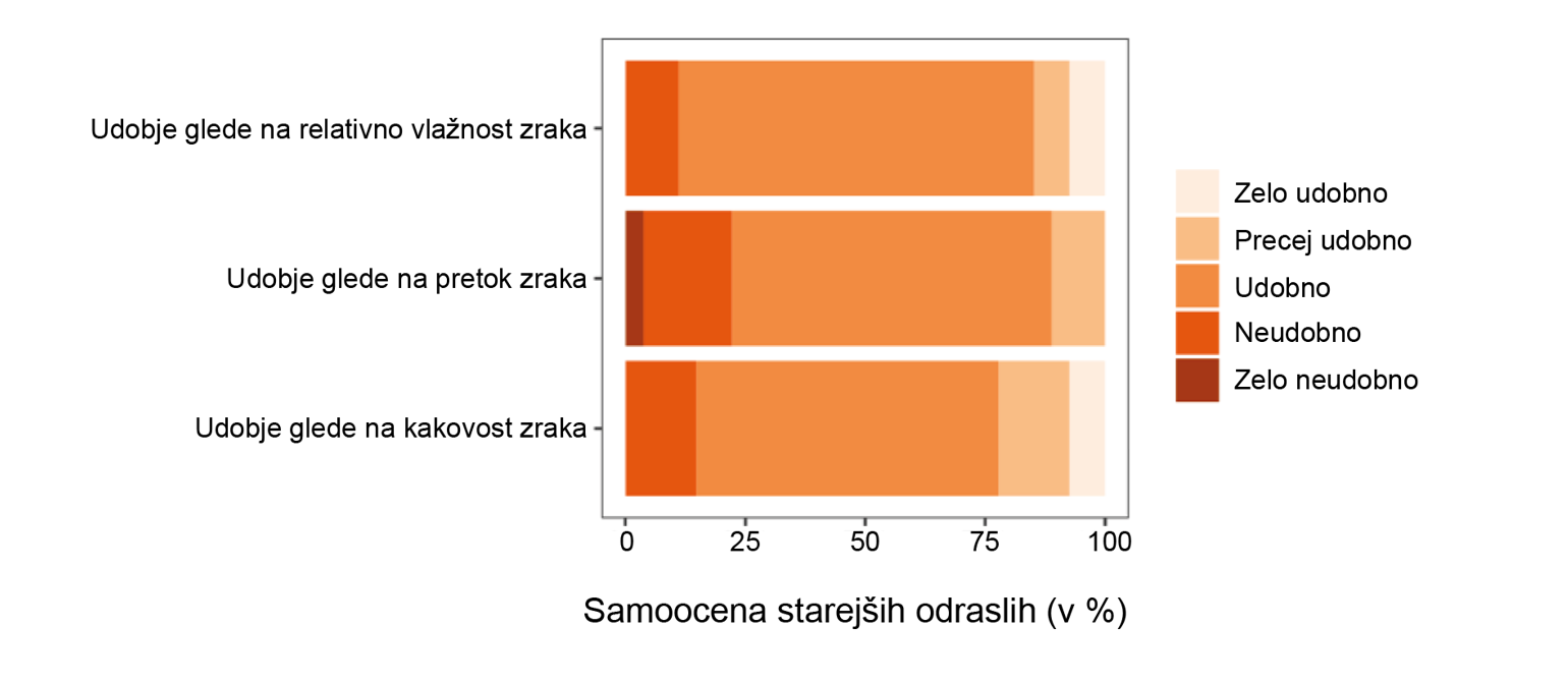 Med sodelujočimi starejšimi odraslimi si je približno 10 % vprašanih želelo toplejši zrak, 13 % hladnejši, medtem ko večina (77 %) ni želela sprememb. Večina (91,2 %) je ocenila, da je temperatura zraka sprejemljiva. Večina udeležencev (57,5 %) je zrak opisala kot svež, 23,4 % jih je ocenilo zrak kot suh, 13,8 % kot soparnega in 5,3 % kot vlažnega.