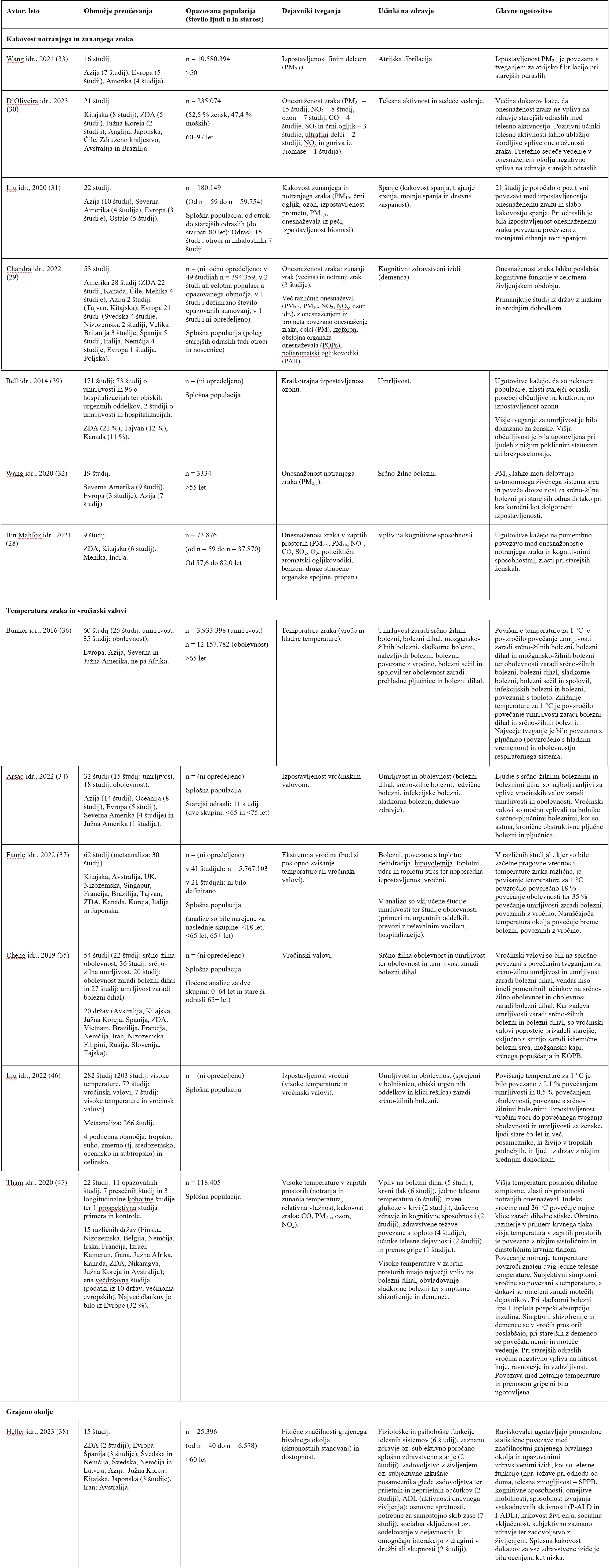 Študije o kakovosti zraka se osredotočajo na izpostavljenost PM2,5, ozonu ter onesnaženosti v notranjih in zunanjih prostorih ter ugotavljajo različne možne negativne učinke na zdravje: atrijska fibrilacija, zmanjšana telesna aktivnost, sedeče vedenje, slabša kakovost spanja, demenca, srčno-žilne bolezni ter kognitivne motnje. Wang in sod. (33) so ugotovili, da lahko izpostavljenost zraku, onesnaženemu s PM2,5, poveča tveganje za nastanek atrijske fibrilacije pri starejših odraslih, in predlagajo, da se poveča ozaveščenost o preventivnih aktivnostih za zmanjšanje izpostavljenosti onesnaženemu zunanjemu zraku. D'Oliveira in sod. (30) so preučevali povezanost med onesnaženostjo z delci PM2,5 in aktivnostmi starejših odraslih, obravnavali so predvsem telesno aktivnost in sedeče vedenje. Telesna dejavnost, ki se izvaja v zaprtih prostorih in na prostem, je lahko ovirana zaradi morebitne izpostavljenosti onesnaženemu zraku. Izpostavljenost onesnaženemu zraku bolj ogroža osebe z zdravstvenimi stanji, kot so zmanjšana pljučna funkcija, visok krvni tlak ter druge srčno-žilne in pljučne bolezni. Tako onesnaženost zraka kot način sporočanja in slabša ozaveščenost lahko doprinesejo k manj pogostemu izvajanju telesne dejavnosti na prostem in prispevajo k bolj sedečemu življenjskemu slogu. Kljub nasprotujočim rezultatom študij (na eni strani ima onesnažen zrak negativen vpliv na zdravje starejših odraslih med telesno aktivnostjo, po drugi strani pa lahko telesna aktivnost ublaži negativne učinke onesnaževal na zdravje starejših odraslih med samo vadbo) rezultati pregleda kažejo, da telesna aktivnost v okoljih z nizkimi koncentracijami onesnaževal prinaša koristi in zmanjšuje zdravstvena tveganja, pasivno sedeče vedenje v okoljih z visoko stopnjo onesnaženosti zraka pa dodatno poslabšuje zdravje starejših odraslih. Telesna aktivnost v okolju z nizkimi koncentracijami onesnaženega zraka prinaša koristi in zmanjšuje tveganje za zdravje, medtem ko dolgotrajno sedenje v okolju z visokimi koncentracijami onesnaženega zraka poslabša zdravje starejših odraslih. Onesnažen zunanji zrak predstavlja pomembno tveganje za zdravje pri osebah s srčno-žilnimi boleznimi, še posebej pri starejših odraslih. Študije so bile večinoma izvedene v urbanem okolju (10 študij), nekatere v mešanem okolju (3 v urbanem in ruralnem okolju, 1 v urbanem, trgovsko-poslovnem in ruralnem območju), v 6-ih študijah niso poročali kraja izvedbe in 1 študija je bila izvedena tako v eksperimentalni komori kot tudi v urbanem okolju. Večina študij je bila izvedena v zunanjem okolju (n = 18), 2 študiji pa v notranjem okolju. Le dve študiji sta izvedli primerjavo med različnimi okolji (1 študija je izvedla primerjavo med zunanjim in notranjim okoljem, 1 med ruralnim in urbanim okoljem). Nadalje so Liu in sod. (31) raziskovali povezave med izpostavljenostjo onesnaženemu zunanjemu in notranjemu zraku in spanjem (kakovost spanja, trajanje spanja, motnje spanja in dnevna zaspanost). Pri odraslih je bila izpostavljenost onesnaženemu zraku povezana s težavami z dihanjem med spanjem. Objavljene študije so ugotovile tudi povezave med splošno kakovostjo spanja, motnjami spanja (npr. povečana dnevna zaspanost, zmanjšano trajanje spanja) in onesnaženostjo zraka. Chandra in sod. (29) ugotavljajo, da lahko izpostavljenost onesnaženemu zraku poslabša tudi kognitivne sposobnosti skozi celotno življenjsko obdobje. Obstaja večje tveganje za razvoj demence pri starejših odraslih. Med drugim avtorji izpostavljajo študijo med starejšimi odraslimi (n = 680, povprečna starost 71 let), ki je odkrila statistično pomembno povezanost med izpostavljenostjo delcem PM zaradi prometa in upadom kognitivnih funkcij. Nobena študija (od skupno 84) ni bila izvedena v državah z nizkim in srednjim socialno-ekonomskim statusom, kljub temu da se marsikje soočajo z visokimi ravnmi onesnaženosti zraka (40, 41) in visokimi stopnjami demence (42, 43). Sistematični pregled epidemioloških študij v zvezi s spremljanjem stopnje umrljivosti ali sprejemov v bolnišnico zaradi kratkotrajne izpostavljenosti ozonu, ki so ga opravili Bell in sod. (39), pa kaže, da so nekatere populacijske skupine, zlasti starejši odrasli, izjemno občutljive na kratkotrajno izpostavljenost povišanim koncentracijam ozona (več kot 100 μg/m³ v povprečju 8-urnega obdobja (44)). Ugotovitve kažejo, da se simptomi zaradi izpostavljenosti ozonu razlikujejo glede na starost in zaposlitev (poklic) ter glede na spol, raso, etnično pripadnost in druge socialno-ekonomske kazalnike. Dokazi o tem, katere populacijske skupine so najbolj občutljive na povišane vrednosti ozona, so potrebni: za obveščanje zdravnikov o tem, kateri bolniki se soočajo z večjim tveganjem; za pomoč nosilcem odločanja, ki oblikujejo predpise o kakovosti zraka; za pomoč občutljivim posameznikom (predvsem posameznikom s kroničnimi pljučnimi boleznimi) in tistimi, ki morda želijo spremeniti svojo izpostavljenost ozonu in razumeti dejavnike tveganja, ki jih ogrožajo. Wang in sod. (32) so raziskovali tveganje za nastanek srčno-žilnih obolenj pri starejših odraslih zaradi izpostavljenosti PM2,5. Izpostavljenost PM2,5 je povezana z zmanjšano variabilnostjo srčnega utripa pri starejših odraslih, kar kaže na motnje delovanja avtonomnega živčnega sistema srca po izpostavljenosti PM2,5. Dolgotrajna izpostavljenost PM2,5 je bila močneje povezana s spremembami variabilnosti srčnega utripa kot kratkoročna izpostavljenost. Visoka variabilnost srčnega utripa je znak zdravega delovanja avtonomnega živčnega sistema srca. To pomeni, da srce prilagaja svoj utrip glede na različne situacije in potrebe telesa, kar je pomembno za uravnavanje krvnega tlaka, dovajanje kisika in hranil v tkiva ter splošno zdravje srca. Rezultati kažejo, da lahko izpostavljenost starejših odraslih delcem PM2,5 spremeni avtonomno delovanje srca in poveča t